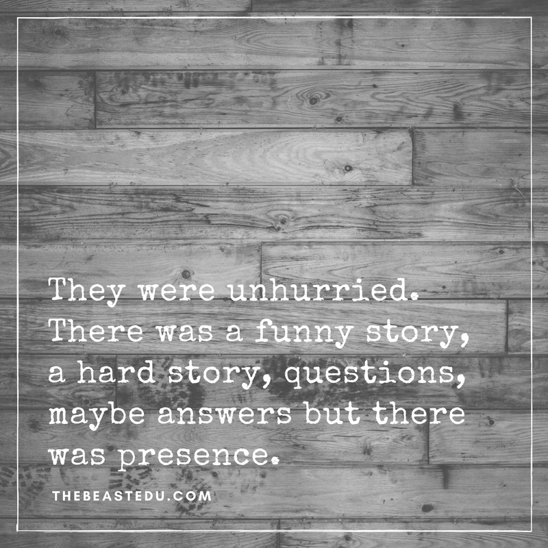 K: I wonder if what we need changes as we learn more about ourselves. I find peace in the silence when I get home before Steve. We rarely talk about my job. His job is different and cool and I get to listen with just my ears and my wine. He is my no expectations place. That being the case, education has changed and so have I. I find myself with a lot to make sense of. It rattles around. The unpack for me isn’t problem solving. The time with you and PUB PD doesn’t feel like we have to throw it all down. It, for me, simply lets me exhale differently with people who matter to me and feels like home in a different way. A rejuvenation…a get.