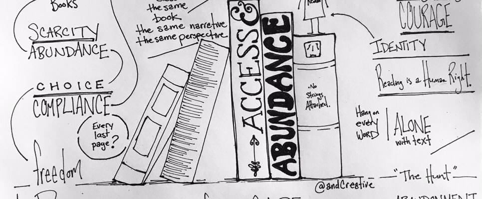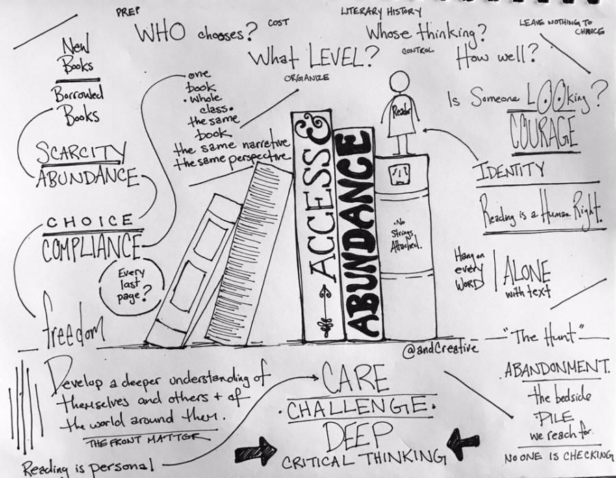 K: I just had to reread above – where you wrote “reading is personal.” We have trouble understanding them. They put their whole lives on social media, struggle with compliance and fight us all the way home as they try to figure out who they are. We respond to this with limitations and rules and expectations. Reading as a human right is as simple and practical a notion as I have ever thought about, yet we want to control it and organize it and sort it out for them – leaving nothing to chance. Everything about adolescence is screaming at us that all they want to do is take chances and we can’t let them.