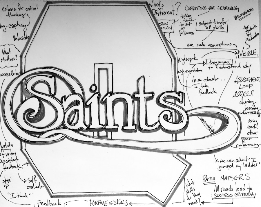 K: I sat in a BIPSAW goal meeting this week (School Climate and Well Being)…we did a sketchnote and asked the question, what’s different? We know that wellness – teacher and student, is linked, deeply linked. When we are effective as educators we see our students learn and flourish. We are linked to each other’s wellness. I think about failure a lot. What it means to fail and how it feels to fail. As educators we know failure. I am thinking about strength and leadership. Can we set conditions in a school for the humans to fail fast and to fail well, to BETA their way through school, to not know and to feel well because of it?