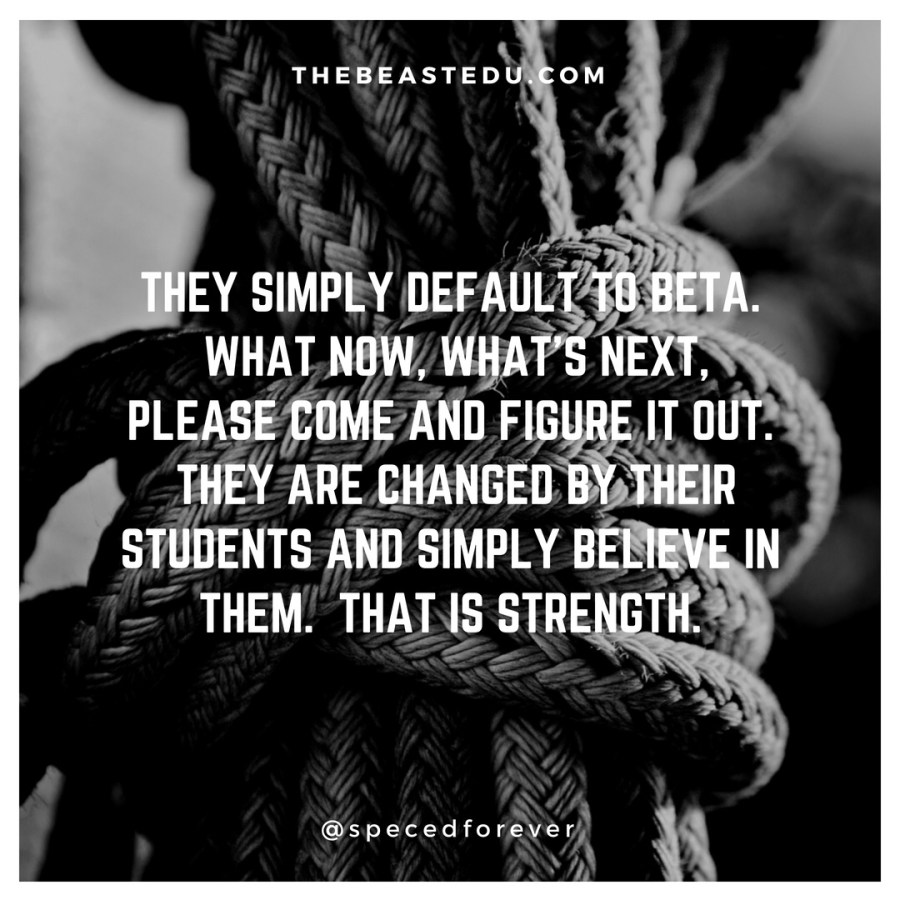 A: But it’s also not strength. Lol When you talk about BETA is makes me think about the reason why blog 17 butted in front of 16. Sixteen was about playfulness, hallways, recess, and well “I don’t know. How can we find out?”. It’s puzzled rather than pissed. Play is iterative and it’s strength of determination and reflection. I’m rethinking what I may have meant by strength and leadership.
