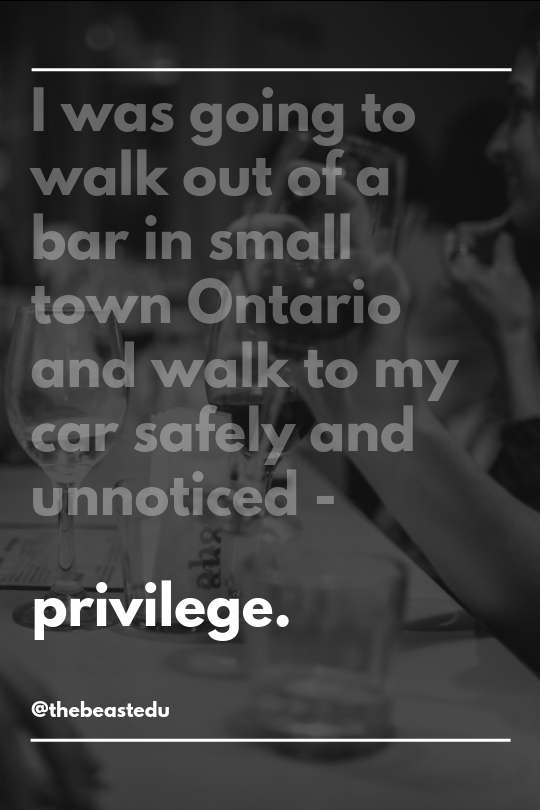 I needed to take one more gage, one more. We chatted about equity and privilege among LGTBQ+ folks. We settled on the personal rights of folks who want to change their pronouns. We talked about people who transition from one gender to another, about fluidity, about gender expression, sexual preference and who I believe I am in the world. He thought to ask if he might assume that I am a woman, that I present as one and that I have a vagina and therefore am a woman. He felt battered by the folks who are offended when he makes a mistake about pronouns and that in a world with two genders, there was a chance he was going to make a mistake but demanding he acknowledge his error and apologize for something that had already been assigned was ridiculous. My friend Cael flooded into me and I truly knew, understanding privilege was not going to happen today. I was grateful for his perspective. It made me check mine. Even standing there in that bar having that conversation was deeply privileged. I was going to walk out of a bar in small town Ontario and walk to my car safely and unnoticed – privilege.