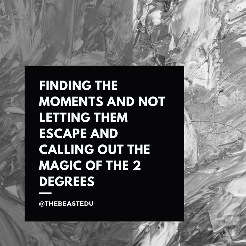 K: No, I wasn’t.  I have learned… perhaps this is ongoing LOL – to wait and to think hard about the right 2 degrees.  I learned that from you too. To leave a question with a question or unanswered is easier for me now.  But to go away and jot it down and to think who else has this wrestling around and to ask it of them or to find a way to get out of the way and pull together those folks (seat them together on the bus) is far harder in the busy of our day.  In a learning team we thought about this and the conditions were exactly right. They would be returning, we had the words and we had the questions left unanswered and a new seating plan. Real life learning feels faster and yet slower. Finding the moments and not letting them escape and calling out the magic of the 2 degrees so it doesn’t feel sneaky seems like the work… I call it out with students much of the time.  I see it or I facilitate it and I call it out. They need to know why. I am really thinking about all learners and the power of the 2 degrees… I am fascinated beyond belief. #sitbeside suddenly feels differently to me.